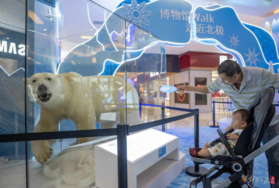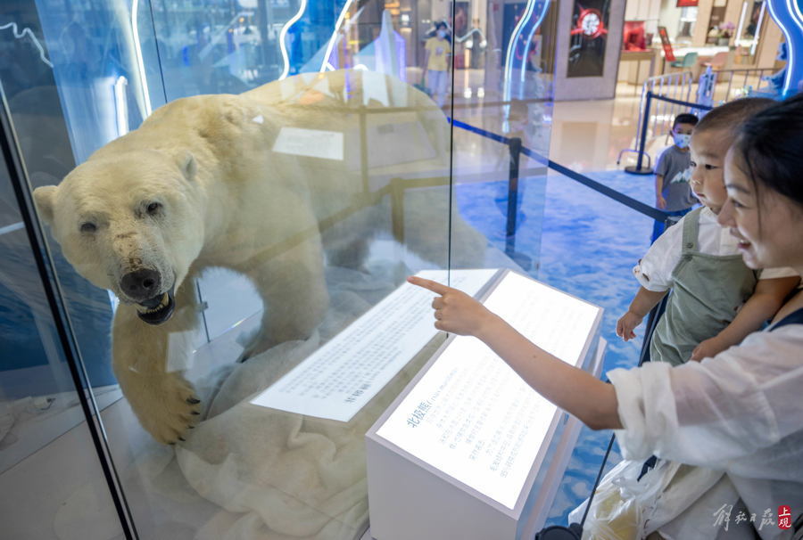 “商场与科普融入总是好的,尤其这样难得一见的标本。大多时候带孩子逛商场不单来买东西,能让孩子增长见识的商场我们也愿意多待一会。”李女士带着儿子观看北极熊标本。