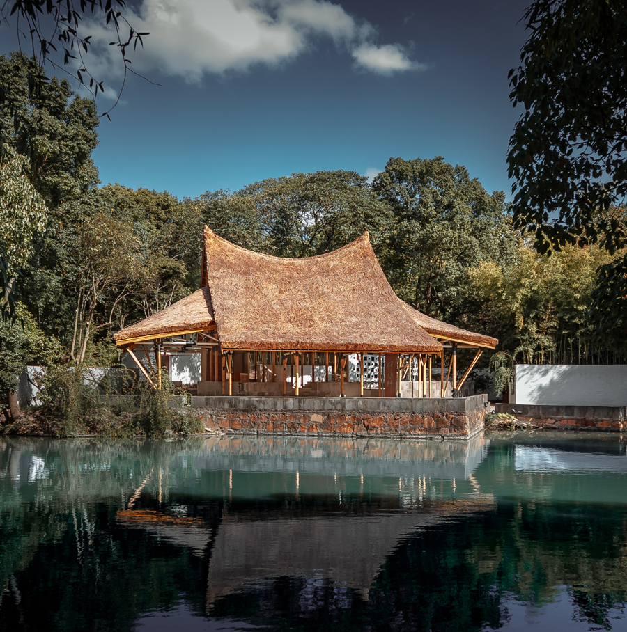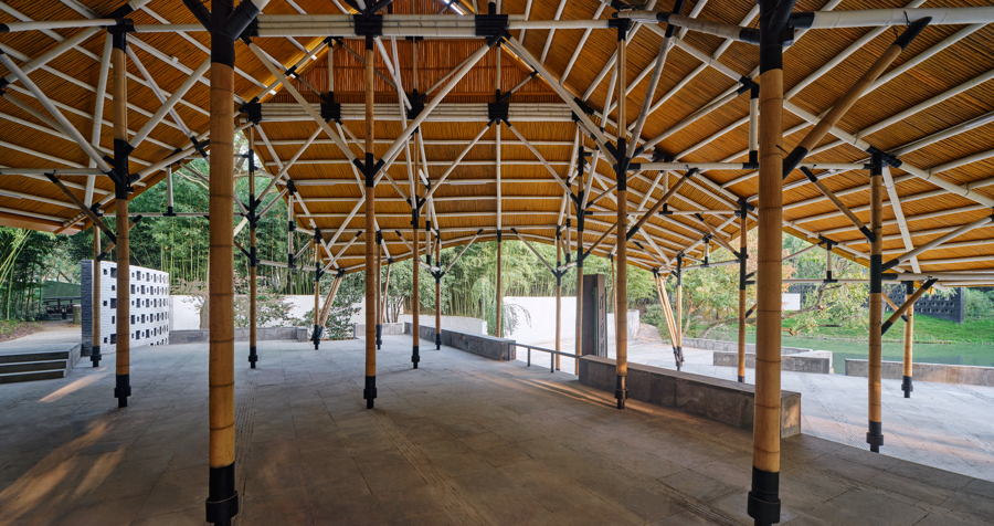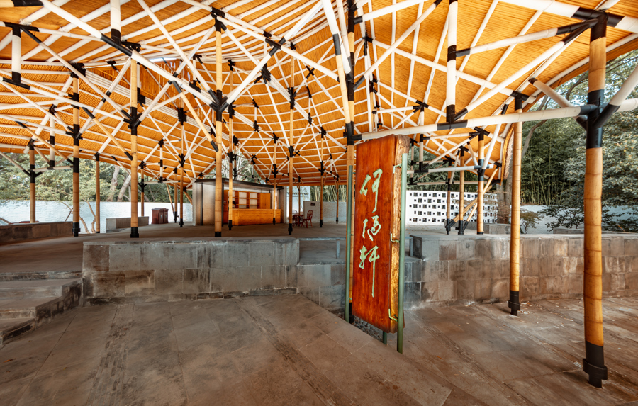 远观,何陋轩材料自然,意境苍古,仿佛一间中国传统草棚,但近看便会意识到,细细的竹竿,支撑起一片大穹顶,现代手法的表达和运用十分精妙。