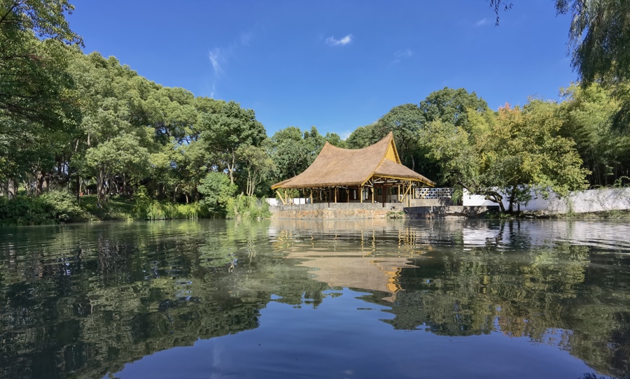 松江方塔园一角,有一个竹子与茅草搭成的茶亭,名为“何陋轩”。