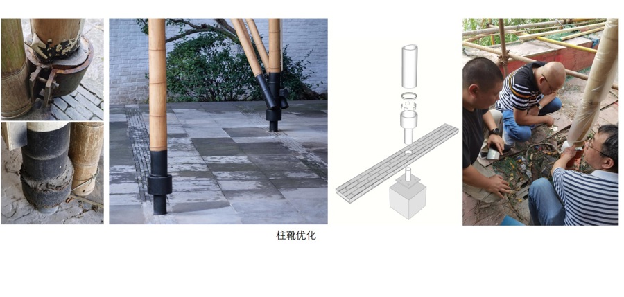 竹子容易腐烂,每一根竹子底部都加了一个“马蹄铁”,插入地面。