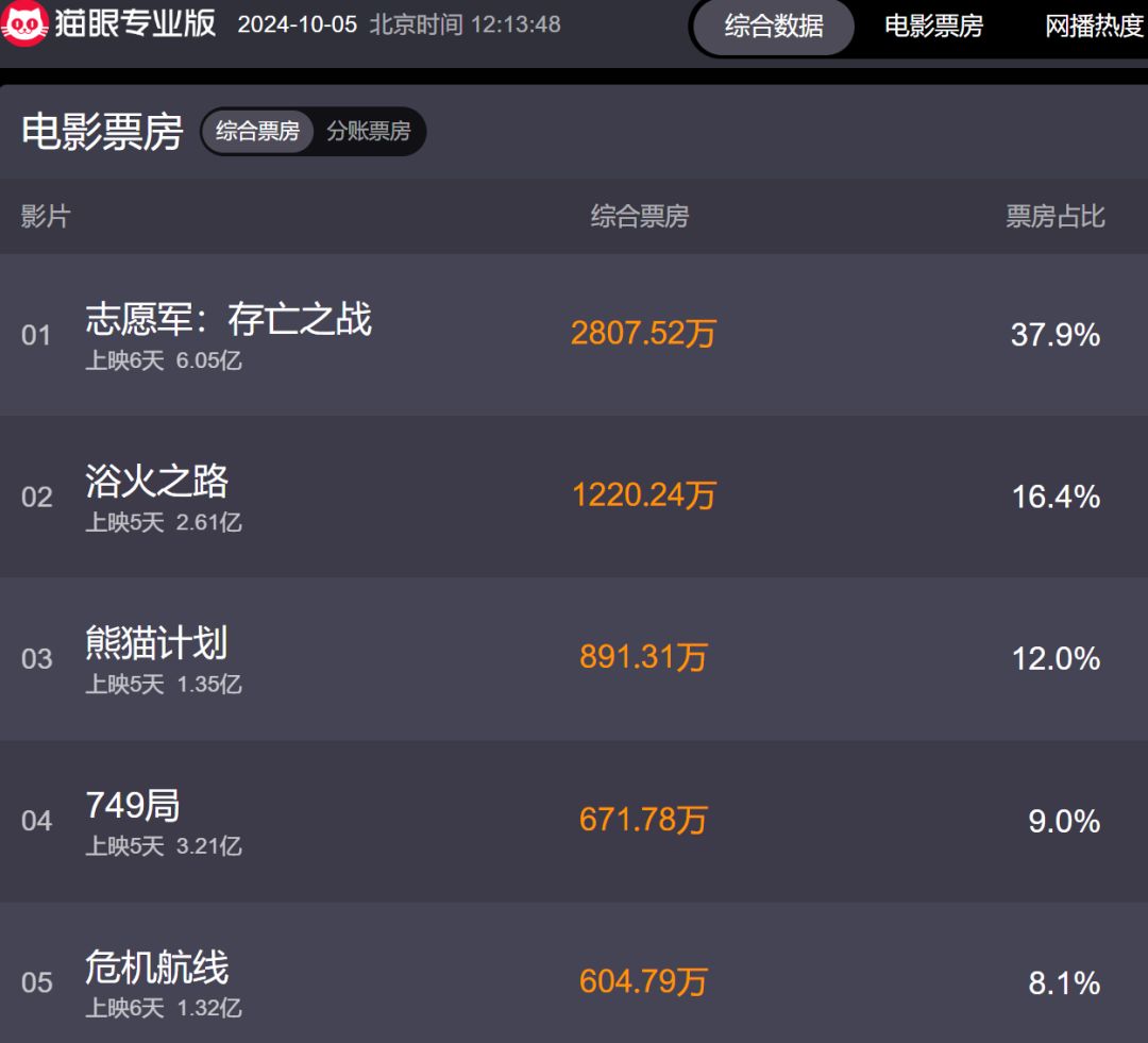 《志愿军:存亡之战》《749局》《浴火之路》分别以6亿元、3.24亿元和2.63亿元的票房成绩,暂列国庆档票房榜前三名。
