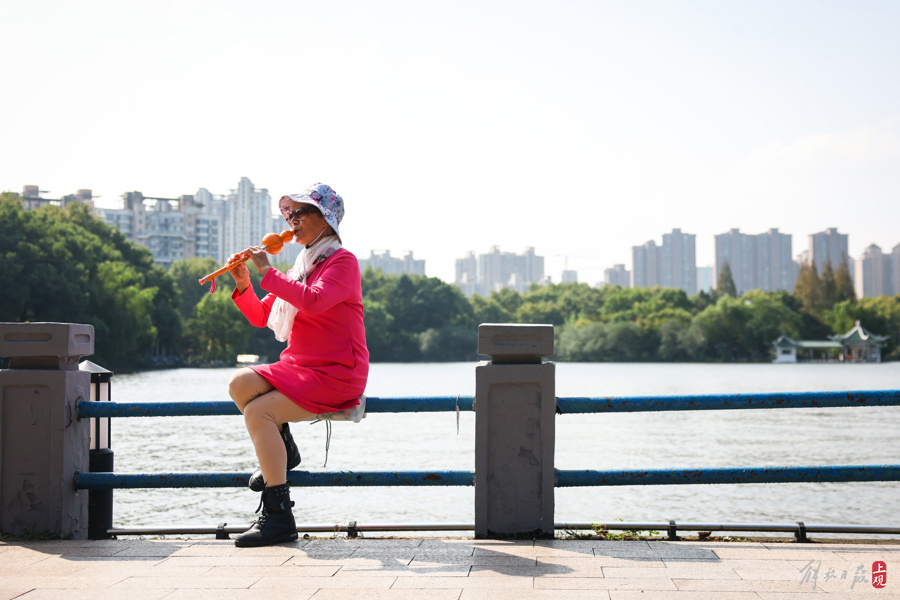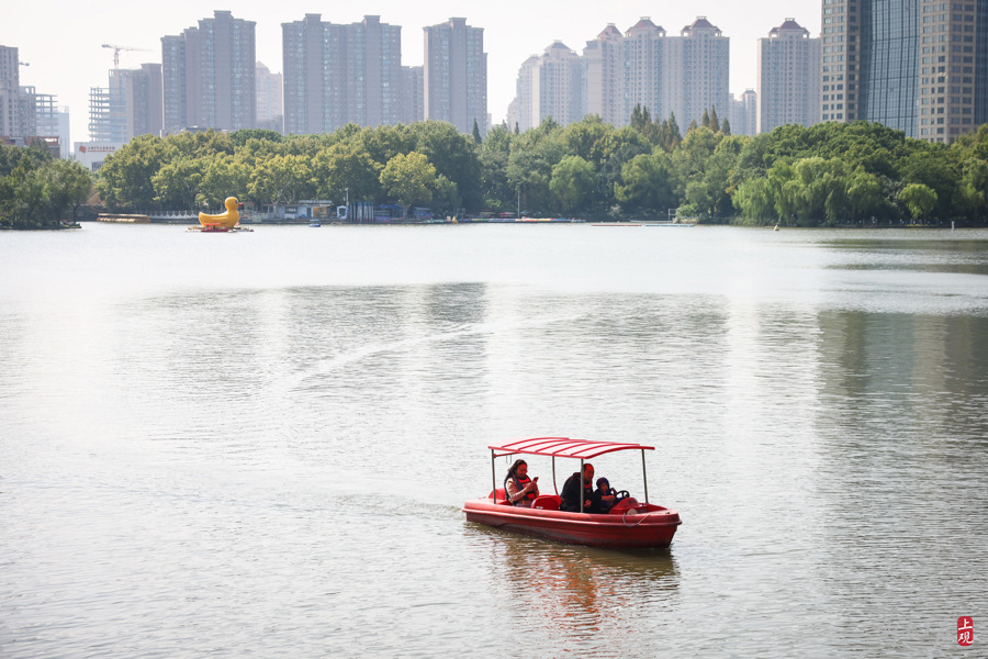10月8日,阳光洒在银锄湖上,波光粼粼,游船在湖面上悠闲地穿梭,游客们或是乘坐电动船,或是脚踏船,享受着秋日的微风和温暖的阳光。