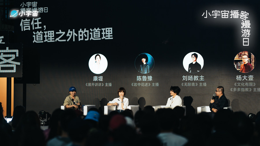 在小宇宙播客漫游日现场,留言墙上,可以看到不少成为主播的名人留言。主持人陈鲁豫说,“小宇宙是我的救星”。她的身份介绍是《岩中花述》主播,去年开始,她成为这档品牌播客的常驻主播。尽管在传统电视圈成名已久,有过《鲁豫有约》等热门节目,但通过播客,很多年轻听众听到的是“不一样的、不限于表情包的鲁豫”,“有态度、有见解,温柔有力,业务能力很强”。