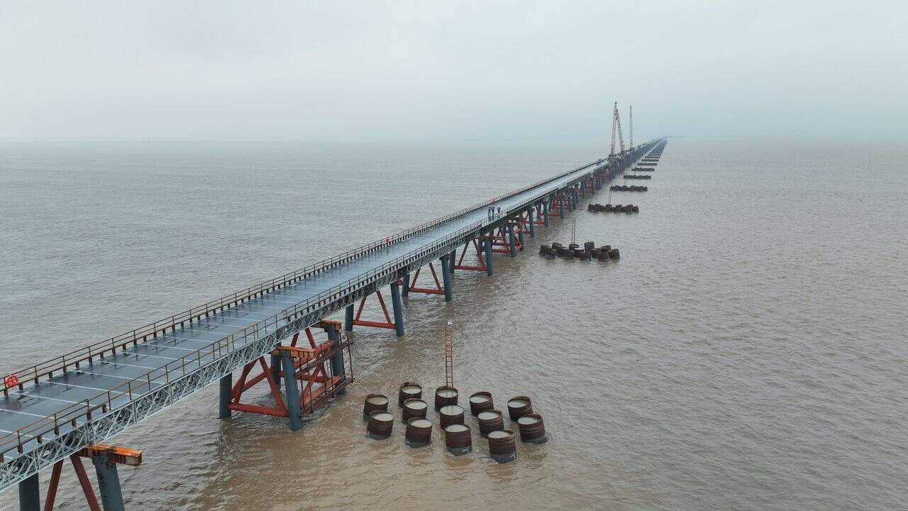 11月10日,杭州湾跨海铁路桥南海中引桥6.96公里栈桥顺利贯通。中交第二航务工程局 图