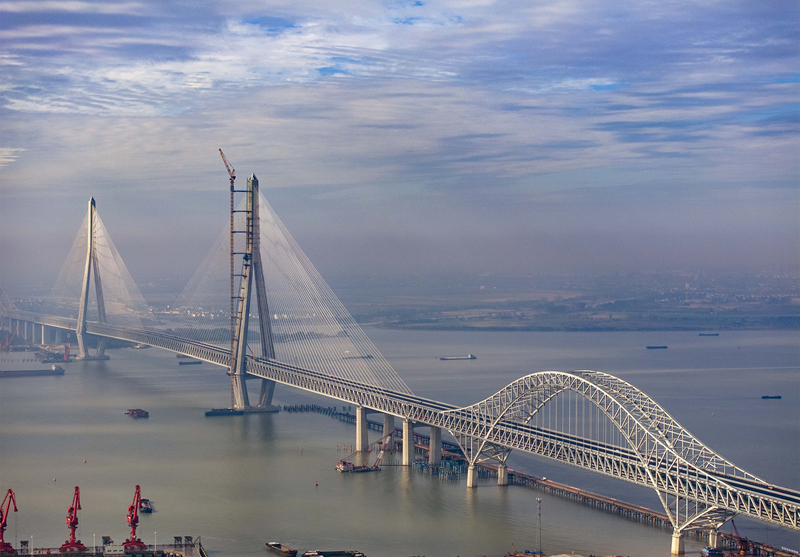 连接常州和泰州两市的常泰长江大桥位于泰州长江大桥与江阴长江大桥之间,是长江上首座集高速公路、城际铁路、普通公路三种方式于一体的过江通道,全长10.03公里,其中公铁合建段长5299.2米,由一座主跨1208米的钢桁梁斜拉桥、两座主跨388米的钢桁拱桥和一座3×124米的连续钢桁梁桥组成。这座预计2025年上半年基本建成的大桥创下了6个世界纪录:不仅是世界上最大规模的多功能载荷非对称布置桥梁、最大跨度的斜拉桥、最大跨度公铁两用钢桁拱桥,且拥有最大连续长度钢桁梁、最大尺度碳纤维复合材料拉索、最高强度桥用平行钢丝斜拉索。