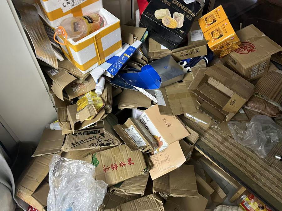 张凯家四处堆放着直播商品拆下来的快递盒。 杨书源 摄