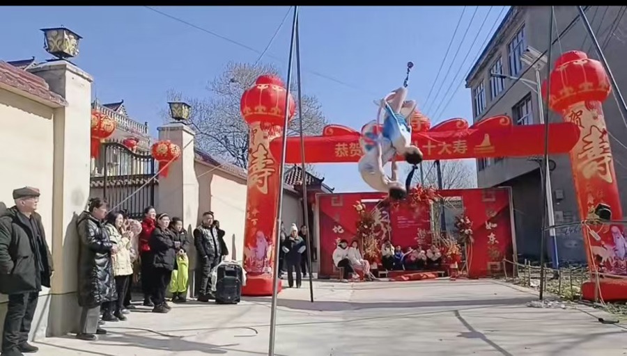 但做了几十年农村唢呐艺人的她,心里也很清楚,表演高空杂技,不单单是赚钱的事,也关乎一个杂技演员是否在农村表演市场“立得住”。