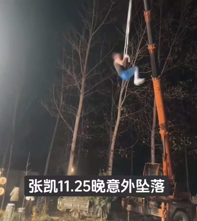 然而,令人惊诧的一幕又发生了——当他在空中完成几次腾空翻转后,杂技绳从高处脱落,张凯被重重甩向地面。