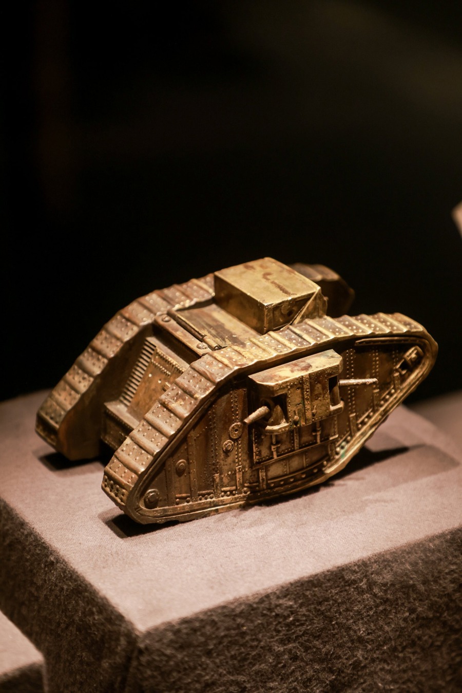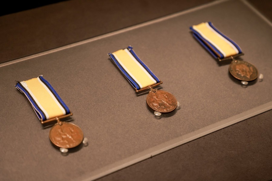 展出的一战华工铜奖章,是第一次世界大战结束后颁发给为英军服务的中国劳工的奖章。奖章正面锻压有第一次世界大战时期英国国王乔治五世的头像和“GEORGIVS V BRITT OMN REX