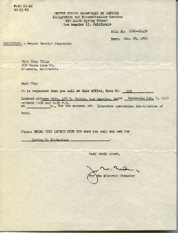 美国司法部移民归化局通知钱学森遵守假释规定的信。