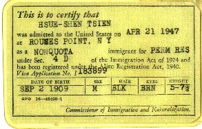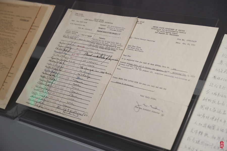 战后,1946年秋,钱学森受聘为麻省理工学院航空工程系副教授,次年3月晋升为教授,时年36岁。1948年8月24日,麻省理工致信告知钱学森加薪事宜,其年薪增至9000美元,也有钱学森银行存折为证。在新鉴定的馆藏国家一级文物中,也包括了美国司法部移民归化局发给钱学森的外籍人士登记卡,以及1953年1月28日移民归化局通知钱学森遵守假释规定的信,此前1950年该局就对其实施禁令。这两张纸连同所谓的行踪报告,见证了钱学森回国前美方政治环境的高压态势,以及他回到新中国的毅然决然。