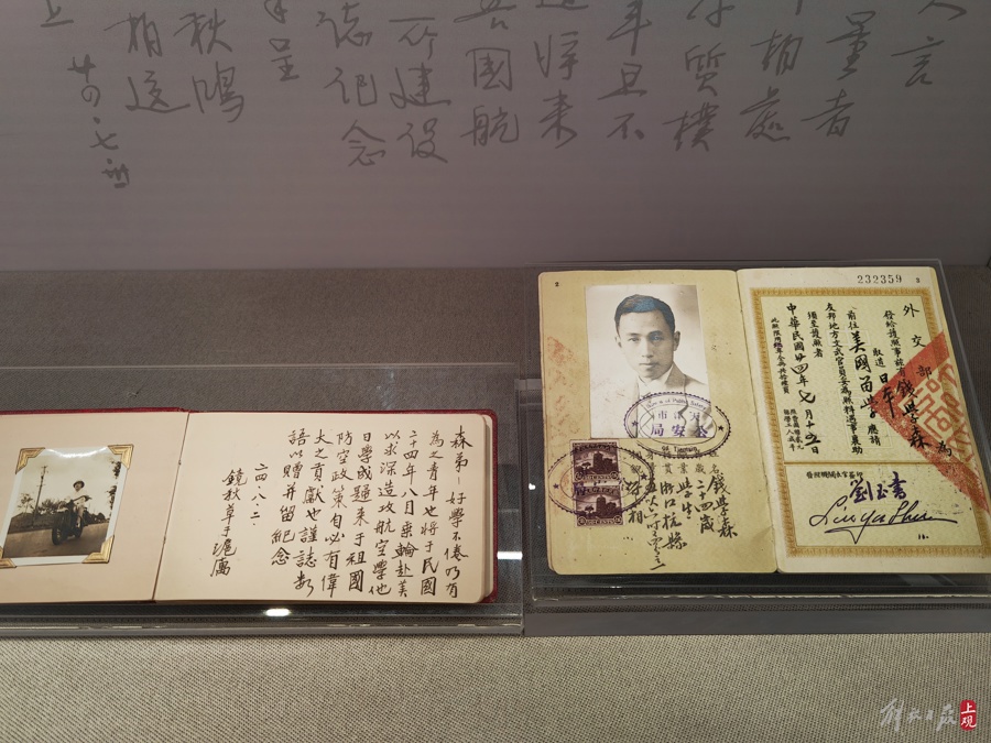 钱学森的“中华民国”护照(右)及1935年赴美留学前的亲友赠言册等。徐瑞哲 摄