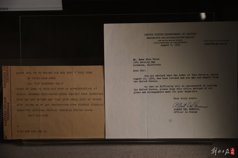 此后几天,又一份“国家一级文物”终于出现。1955年8月4日,这就是美移民局通知钱学森可以离开美国的信。紧接着,钱学森又收到了1955年9月7日陈叔通发出的可以回国的电报。至此,有了这两张纸,他回到新中国的路才宣告铺平。