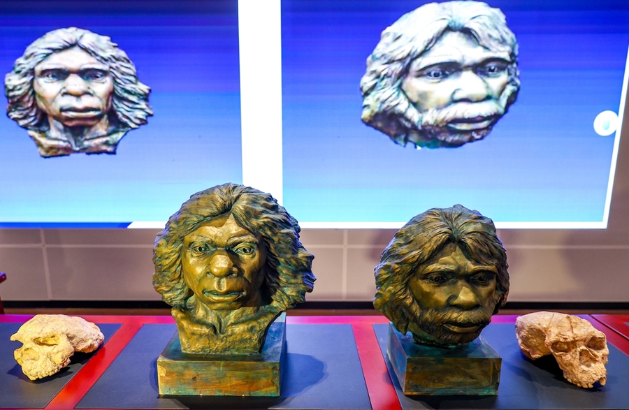 根据“郧县人”头骨化石复原的“郧县人”相貌,左为女性,右为男性。