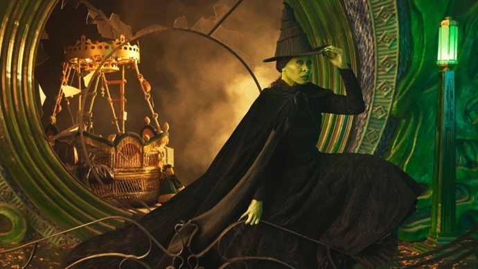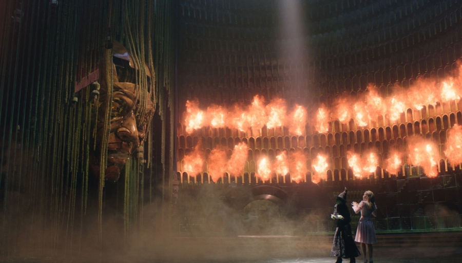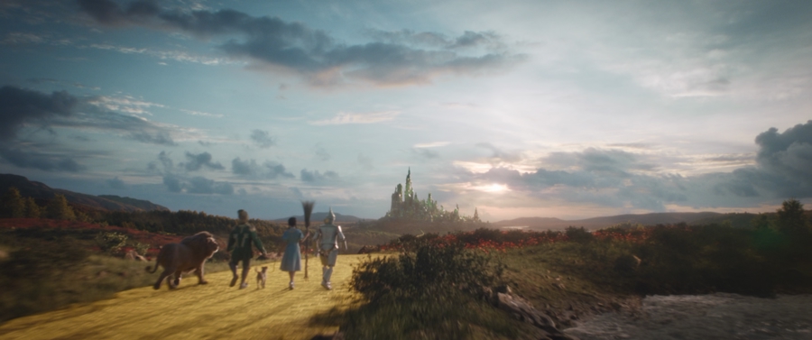 电影《魔法坏女巫》在熟悉的、雷霆般的《没人同情坏女巫》大合唱中开场,然而影像带来的冲击是直观的:这不是音乐剧观众了解的舞台剧了。随着“好女巫”格琳达的旁白讲出“坏女巫融化在一桶水里”,镜头离开阴森城堡,全景是奥兹国的彩虹田园,多萝西和伙伴们的背影惊鸿一瞥地出现在画面边缘。