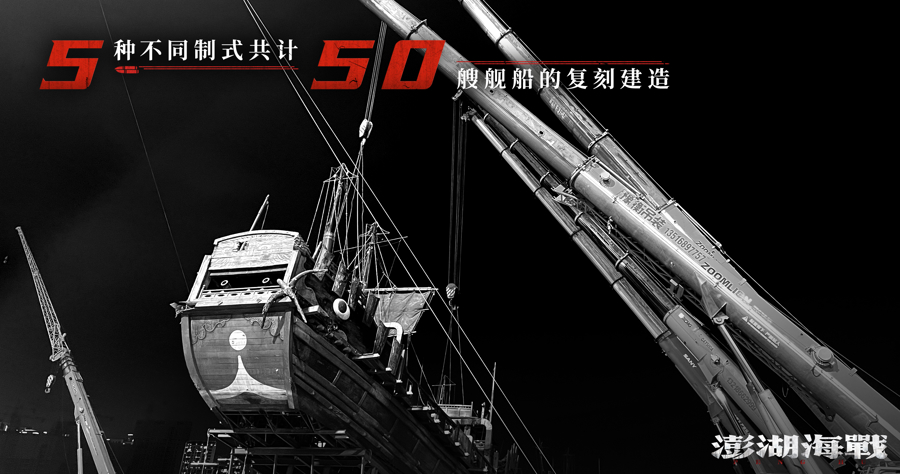 筹备期间,为了一比一真实还原这场海战中的各式战船,剧组主创调取、查阅及实地走访调查近百万字的历史资料,最终实现了这场海战过程中所涉及的5种不同制式共计50艘舰船的复刻建造,其中长达近40米的主战舰船就复刻了12艘之多。上海中国海洋博物馆中,唯一一艘复刻的古战船长度31米,而《澎湖海战》所复刻的古战船,是迄今国内复刻体积最大的,也是精细度最高及数量最多的古战船。