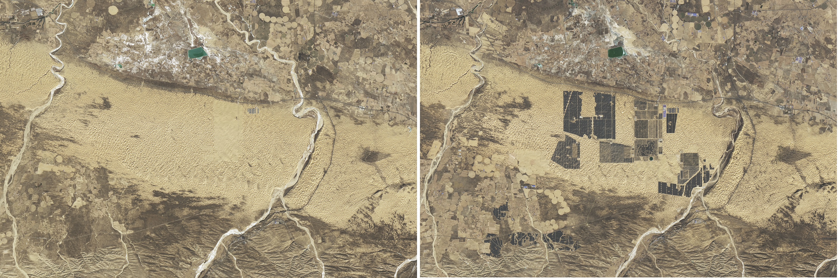 美国航空航天局发布的库布其沙漠2017年(左)和2024年的卫星图像。(美国航空航天局“地球观测站”网站)