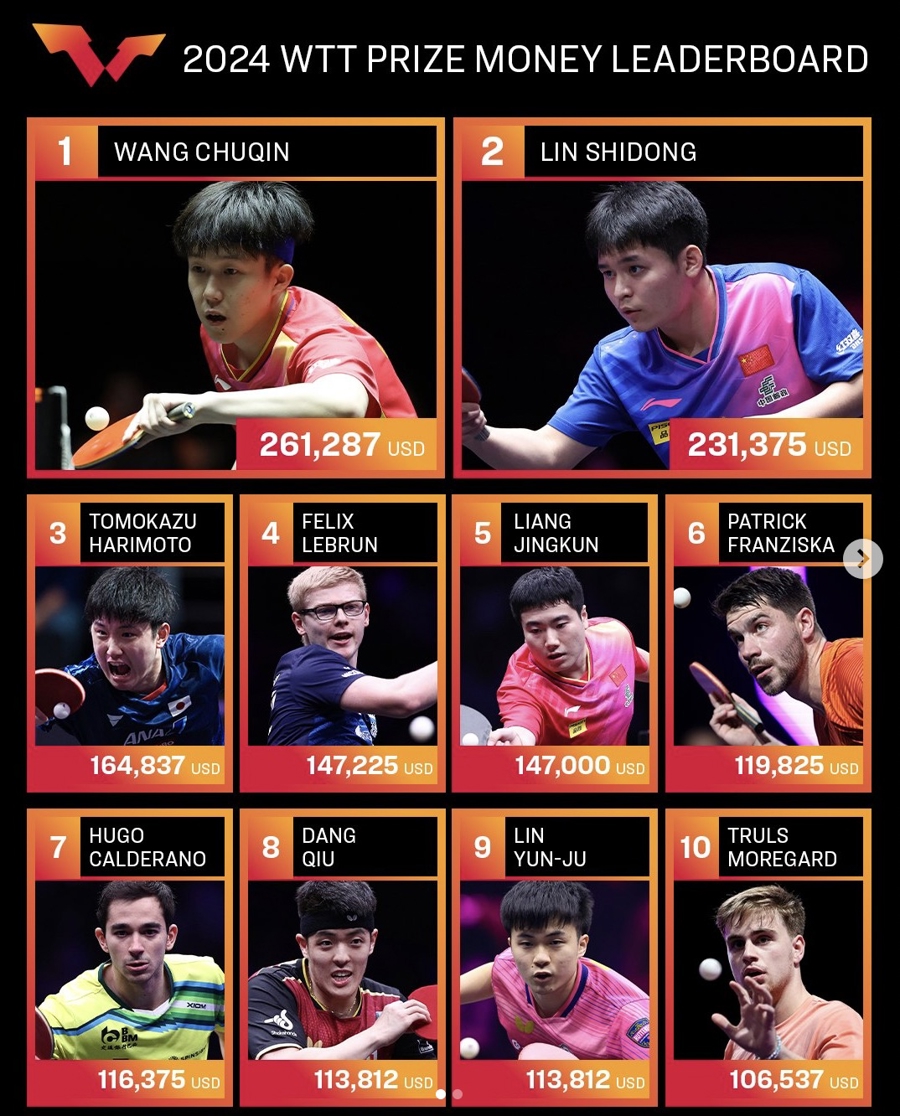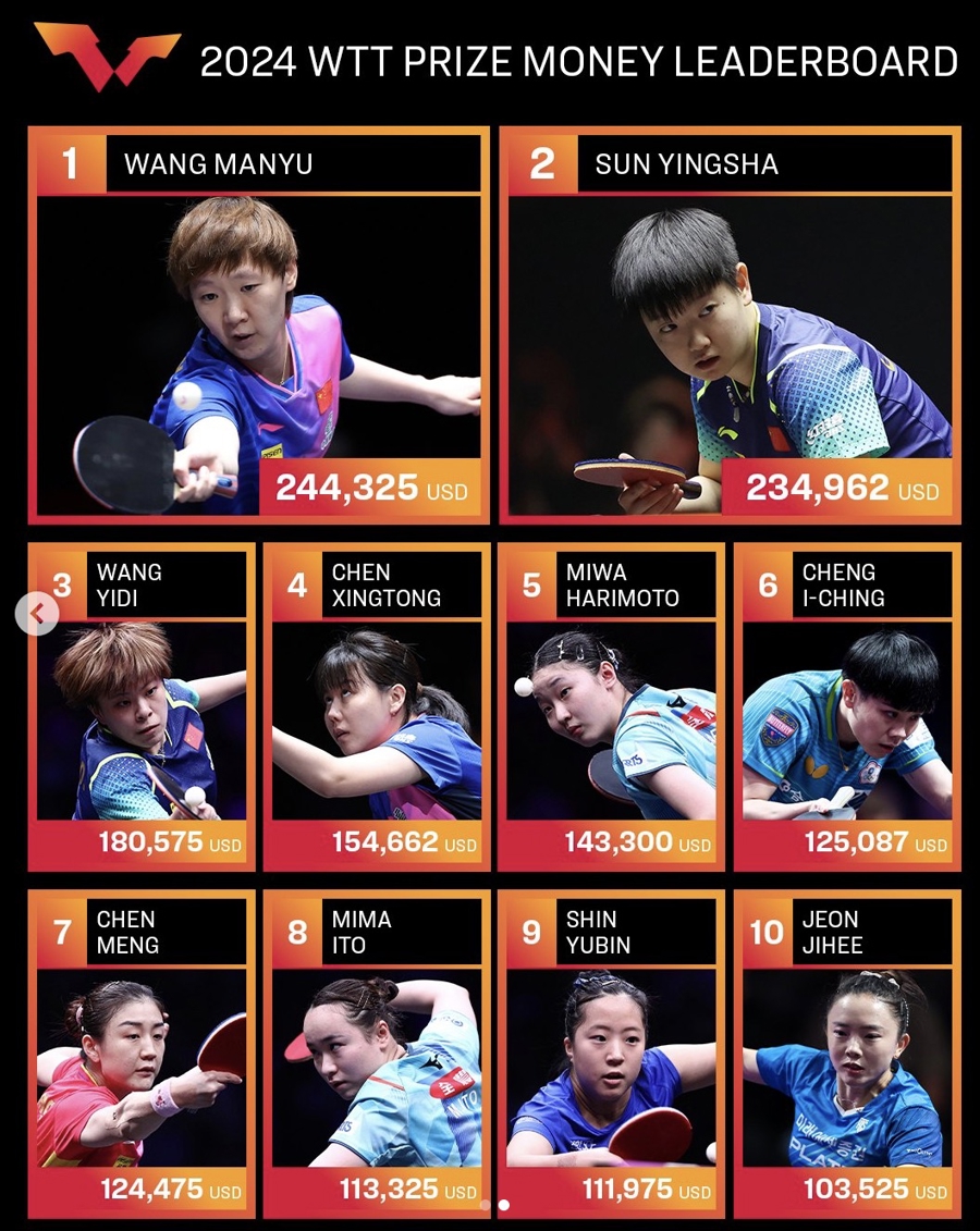 WTT去年11月底公布的年度男女球员赛事奖金排行榜显示,2024赛季获得奖金最多的选手是王楚钦(26.1287万美元),王曼昱(24.4325万美元)和孙颖莎(23.4962万美元)位居二、三位。这与中国网球“一姐”郑钦文高达556万美元的年度比赛奖金收入有天壤之别。