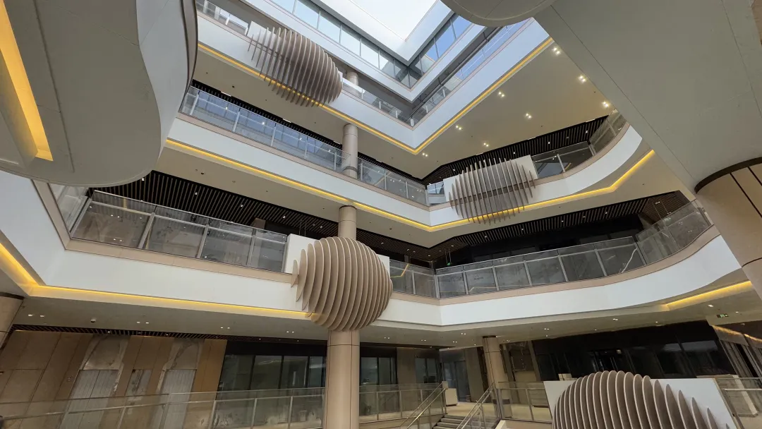 当前,商场外立面已全部完工,金光闪闪的铝扣板搭配大片落地窗户,风格时髦大方;项目内,工人们头戴安全帽,正在对户外空间、公共区域等细节进行打磨,现场井然有序。