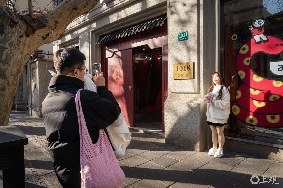 愚园路上的新年蛇造型成为热门打卡地,不少人是跟着小红书而来,周边街景和新春氛围也很搭,适合拍摄。即便不是专门前来,路过时也会忍不住拍几张,觉得这里的新年装很“出片”。
