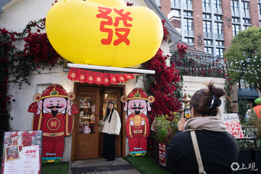 愚园路上,市民在新春主题装饰前合影。