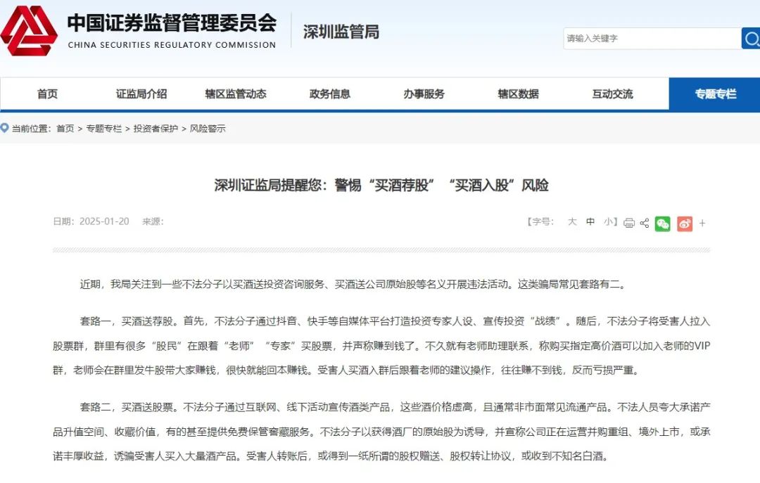 买酒送投资咨询服务、买酒送公司原始股?近日,深圳证监局发布最新风险警示,揭露了“买酒荐股”“买酒入股”的最新骗局。
