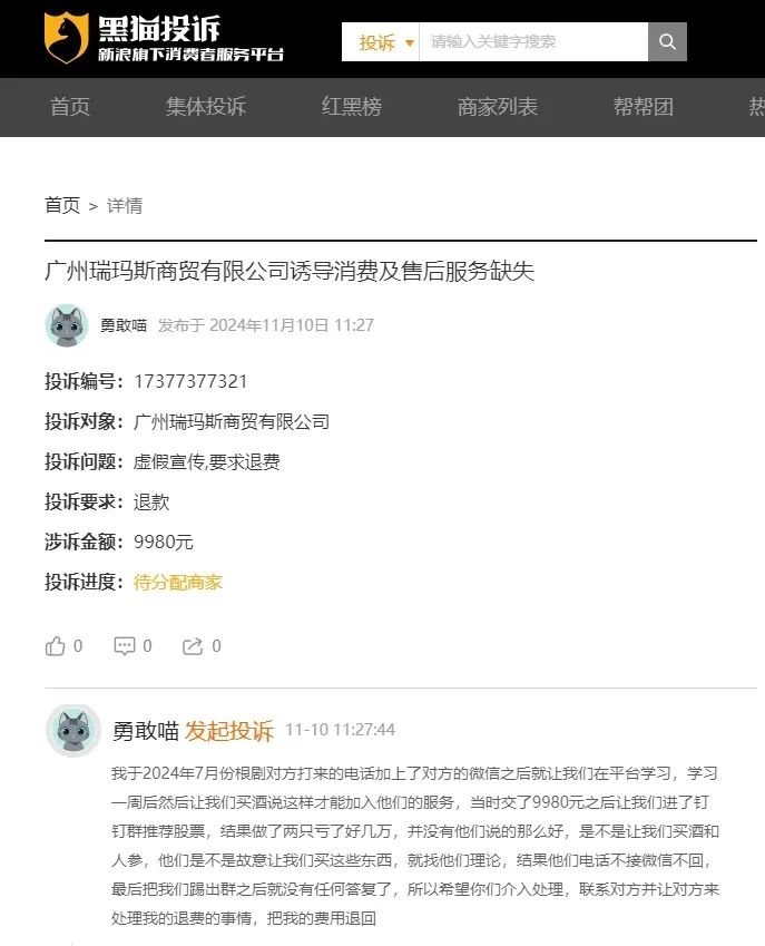 比如,一位用户投诉某公司,该用户称,2024年7月份根据对方打来的电话加上微信之后,进入对方平台学习,学习一周后,对方让买酒,才能加入他们的服务。“当时交了9980元之后让我们进了钉钉群,并推荐股票,结果做了两只亏了好几万,找他们理论,但他们电话不接微信不回,最后把我们踢出群之后就没有任何答复了。”该用户称。