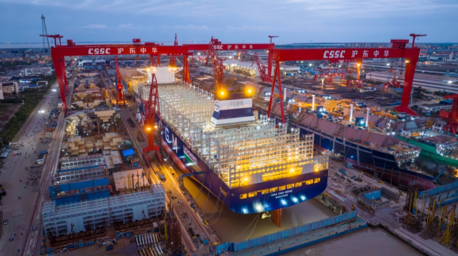 法国达飞集团订造、由沪东中华建造的全球最大的2.4万标箱LNG双燃料动力超大型集装箱船,2024年底在上海出坞。
