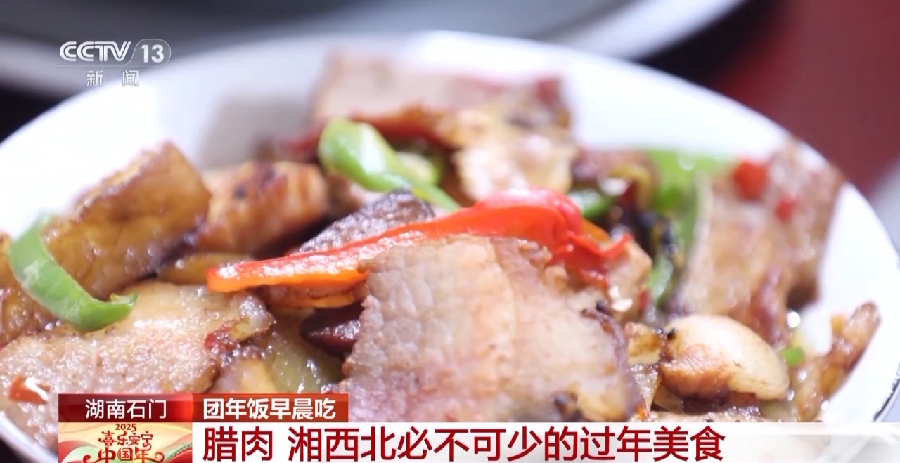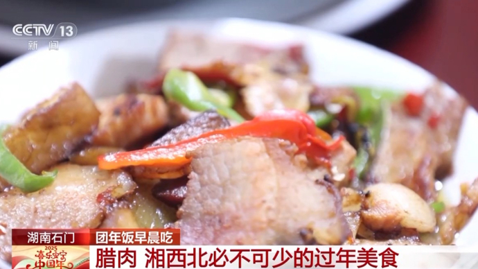 在餐桌上,还有湘西北地区团年饭餐桌上必不可少的一道美食——腊肉。