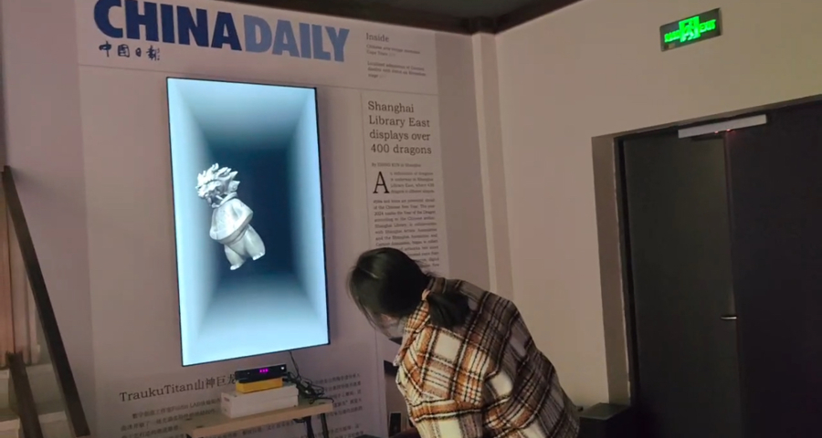 展览的中心,参观者的目光纷纷聚焦于一座时尚的黑陶雕塑——但不是它的实体,而是一张报纸里的动态图像。参观者站在“TraukuTitan山神巨龙”之前,经过动态捕捉的交互设计,山神巨龙可以做出与参观者相同的动作。不少小朋友都争相体验。这件作品由上海视觉艺术学院优秀毕业生徐翰阳与龙山黑陶非遗代表性传承人曲冰携手创作。黑陶,作为中国传统工艺之一,历经千年风雨,而在这座雕塑中,黑陶的古老技艺与现代艺术形式相得益彰,焕发出前所未有的现代光彩。