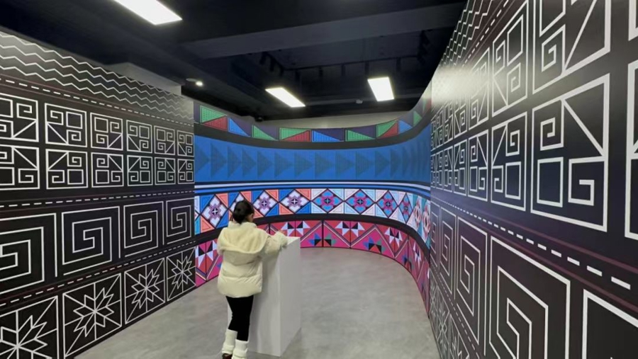 展览中的另一亮点是“哈尼暖域”,这件作品巧妙融合了哈尼族的传统文化与现代设计。哈尼族的服饰制作工艺繁复,以黑色为主色调,涵盖27道精细工序,图案背后蕴藏着丰富的历史和文化。在“哈尼暖域”展项中,观众不仅能直观欣赏这些传统图案,还能通过多媒体技术与它们亲密互动。上海视觉艺术学院的张雅真老师与西双版纳阿卡亢博滇航“哈尼族服饰制作技艺”传习所的代表性传承人张琳艳携手创作,将这些传统元素经过编程,不同纹样组合成新的花布图案,让哈尼族文化焕发出新的生命力。