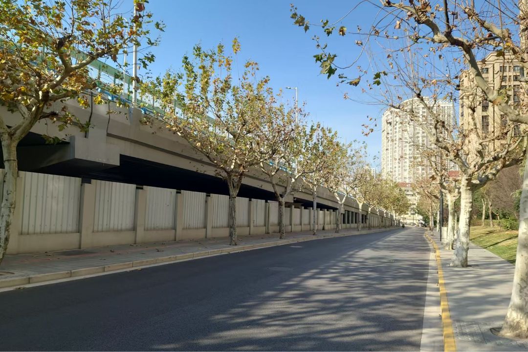 2025年,引桥边整洁的林荫道(胡俊 摄)
