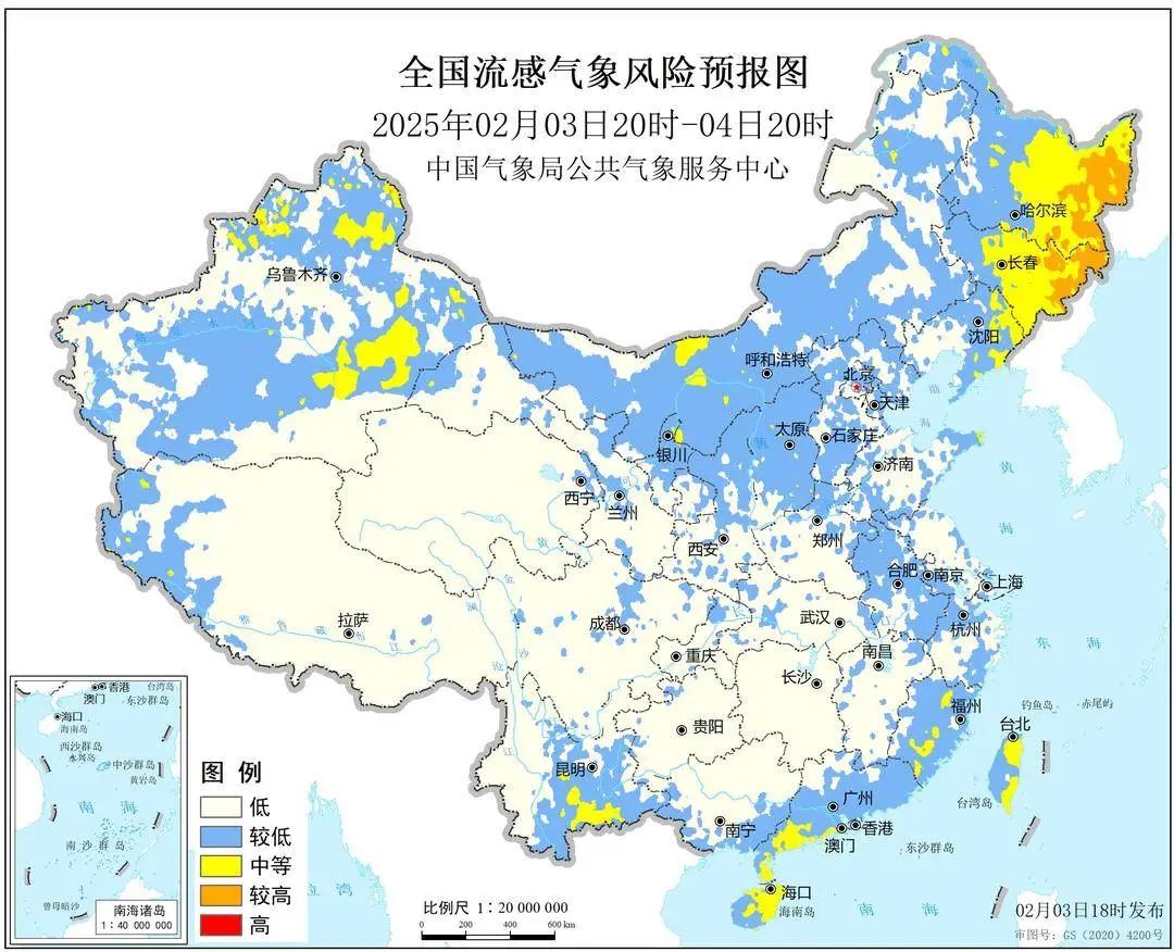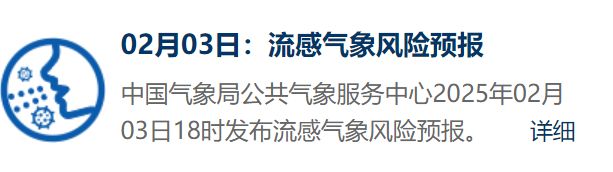 登录中国天气网,在“最新气象公告”中即可查询流感气象风险预报。根据中国气象局公共气象服务中心2月3日18时发布流感气象风险预报:预计,2月3日20时-4日20时,东北中东部、华东中南部、华南中南部及新疆北部和东南部等地的部分地区有中等流感气象风险,其中黑龙江东部、吉林东部的局部地区有较高流感气象风险。