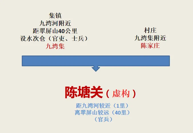 根据以上描述可知:陈塘关距九湾河仅1里余(较近)、离翠屏山40里(较远)。且陈塘关作为李靖驻守的地方应有官兵。