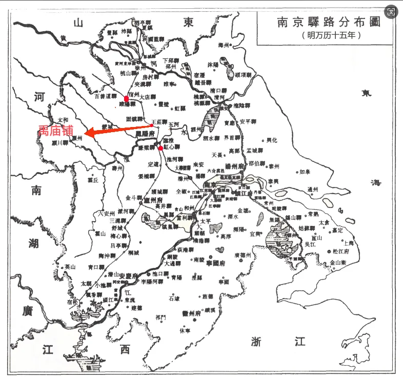 这7条路在凤阳府境内的宿州睢阳驿和临淮县红心驿之间重合为一条路。红心驿到睢阳驿之间为300里,禹庙铺向南分别是王庄驿、濠粱驿、红心驿,向北分别是固镇驿、大店驿、睢阳驿,而禹庙铺几乎处在红心驿和睢阳驿的正中间。