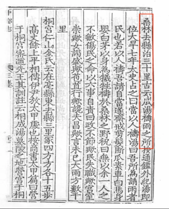 明成化《中都志》三卷在介绍亳州的古迹时有如下文字:桑林去县治三十里,古云成汤祷雨之所。