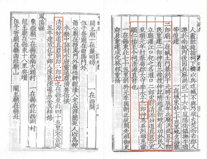 明成化《中都志》四卷《祠庙》在介绍临淮县的二郎庙时写道:二郎神有二,按搜神记,隋赵昱斩蛟有功於民人,立庙,灌江口祀之,名灌口二郎,宋封清源妙道真君。