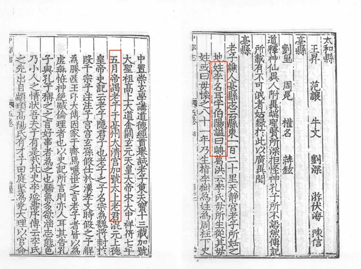明成化《中都志》五卷《道释神仙异人附异端》在介绍亳县的老子时写道:姓李名耳字伯阳谥曰聃;宋大中祥符七年五月帝谒老子,加号“太上老君”。