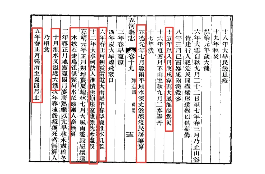 此外,据明代天启《凤阳新书》记载:明嘉靖、隆庆年间凤阳境内经常有水灾,其中隆庆三年、二十一年等年份大水时“平地行舟”。光绪重修《五河县志》卷十九“杂志•祥异”记载,明弘治、正德、嘉靖年间,五河县境内经常遭水灾,其中正德元年七月“骤雨平地水深丈余”、嘉靖三十四年五月“河水暴涌平地深丈许”、嘉靖四十四年五月“淮水骤涨村落陷没城内水深五尺余”。