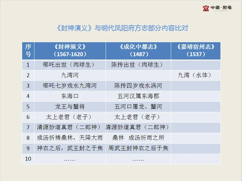 通过比对发现,如“武王封神农之后于焦”“成汤祈祷桑林”“太上老君”“清源妙道真君”等《封神演义》中一些重要人物和故事情节,尤其是“肉球生”“九湾河”“东海口”“龙王与蟹将”及屠龙等哪吒闹海的主要地名和重要情节,在《封神演义》问世前的明成化《中都志》和明嘉靖《宿州志》等明代凤阳府方志中都能找到相同或相近的内容。