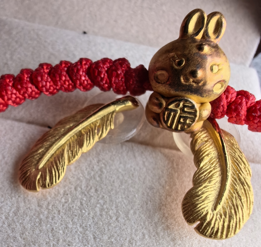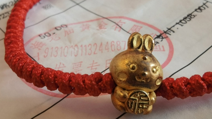 2023年4月2日,黄女士带着小金兔,再次来到店里,请店员重新编织了一根红绳子。遗憾的是,红绳编织的手寸有点大,不合孩子的手腕。“我们想着,索性等孩子长大一些再戴。从此,小金兔就放在原配的盒子里(单独存放),一直没有被佩戴过。”