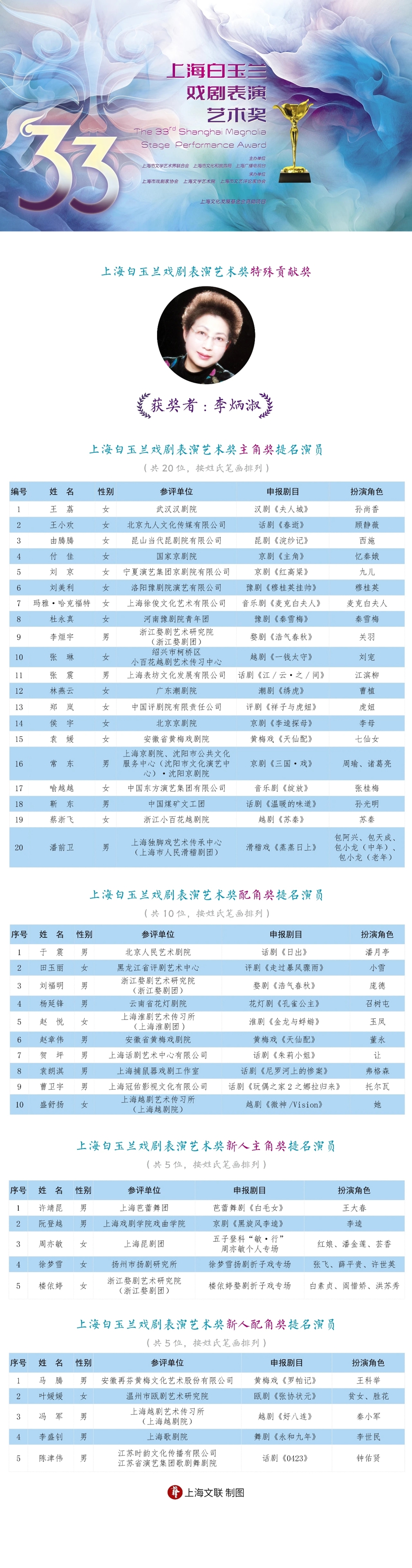 2月12日,第33届上海白玉兰戏剧表演艺术奖公布奖项提名名单,提名奖获奖演员共40人,其中主角奖20人、配角奖10人、新人主角奖5人、新人配角奖5人。京剧表演艺术家李炳淑获特殊贡献奖。2月27日晚,颁奖晚会将在上海文化广场举行,现场揭晓各奖项名单。