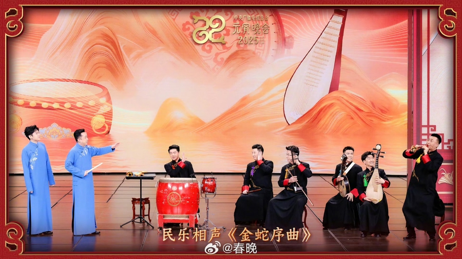 民乐与相声的碰撞也创造出了一种全新的视听体验。相声《金蛇序曲》中,中央民族乐团的乐手们不仅展现了民族乐器的魅力,还巧妙地将现代曲风融入其中,当葫芦娃的旋律在乐器间回荡时,耳熟能详的音符与新颖的编曲带来了一种耳目一新的感觉。更具创意的是,美声与越剧的跨界合作——《相思》在无锡分会场的演绎中,蔡程昱和李云霄这对俊男靓女,以其细腻的歌声和戏腔融合的表现,让这首经典歌曲焕发出了新的光彩。