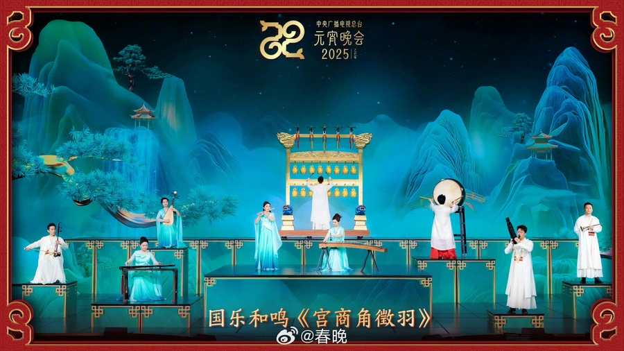 麒麟献瑞,舞蹈《麒麟》中演员们身着翩翩华服,气宇轩昂、英姿飒爽,重现了《诗经》中振振公子的卓然风采。北京、重庆、武汉、拉萨、无锡的五地乐手,隔空齐奏国乐《宫商角徵羽》,笙、笛、古琴等九种民族乐器共同带来的悠扬五音,奏响五千年中华文明共振同鸣,祈愿新的一年五福临门、五谷丰登。