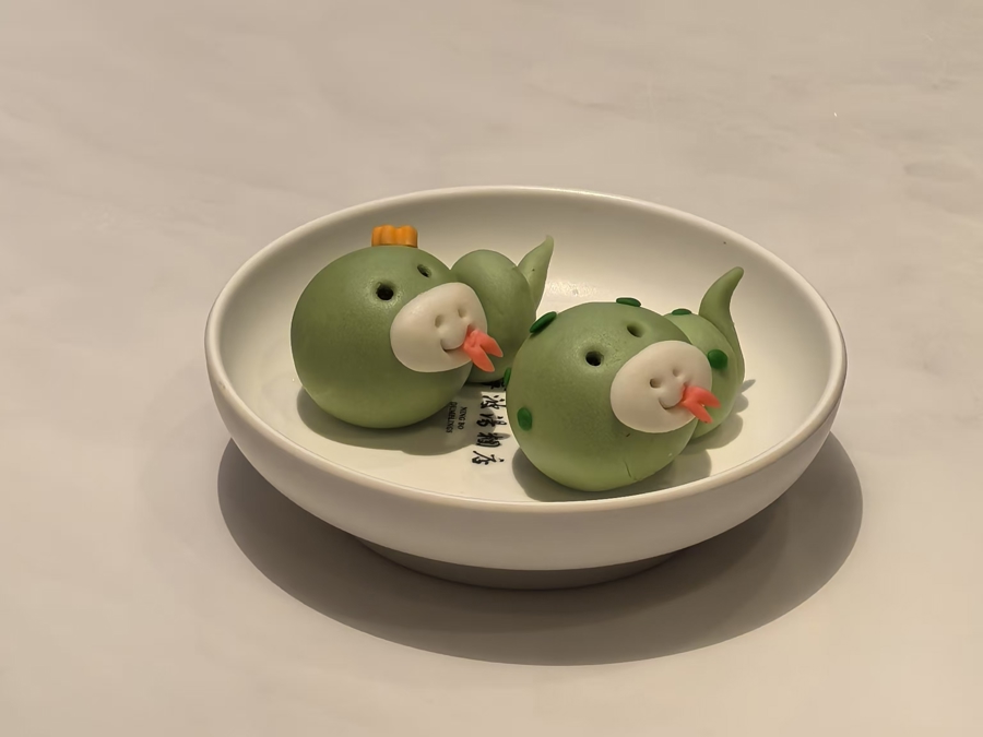 记者看到,“蛇宝汤团”分为 “男宝”和“女宝”两款,“男宝”身上点缀着菠菜绿的斑点,灵动活泼,“女宝”则头戴娇艳的橘粉色小花,脸颊上还晕染着一抹淡淡的腮红,娇俏可爱。馅料有香甜的莲蓉和细腻的枣泥两种选择。