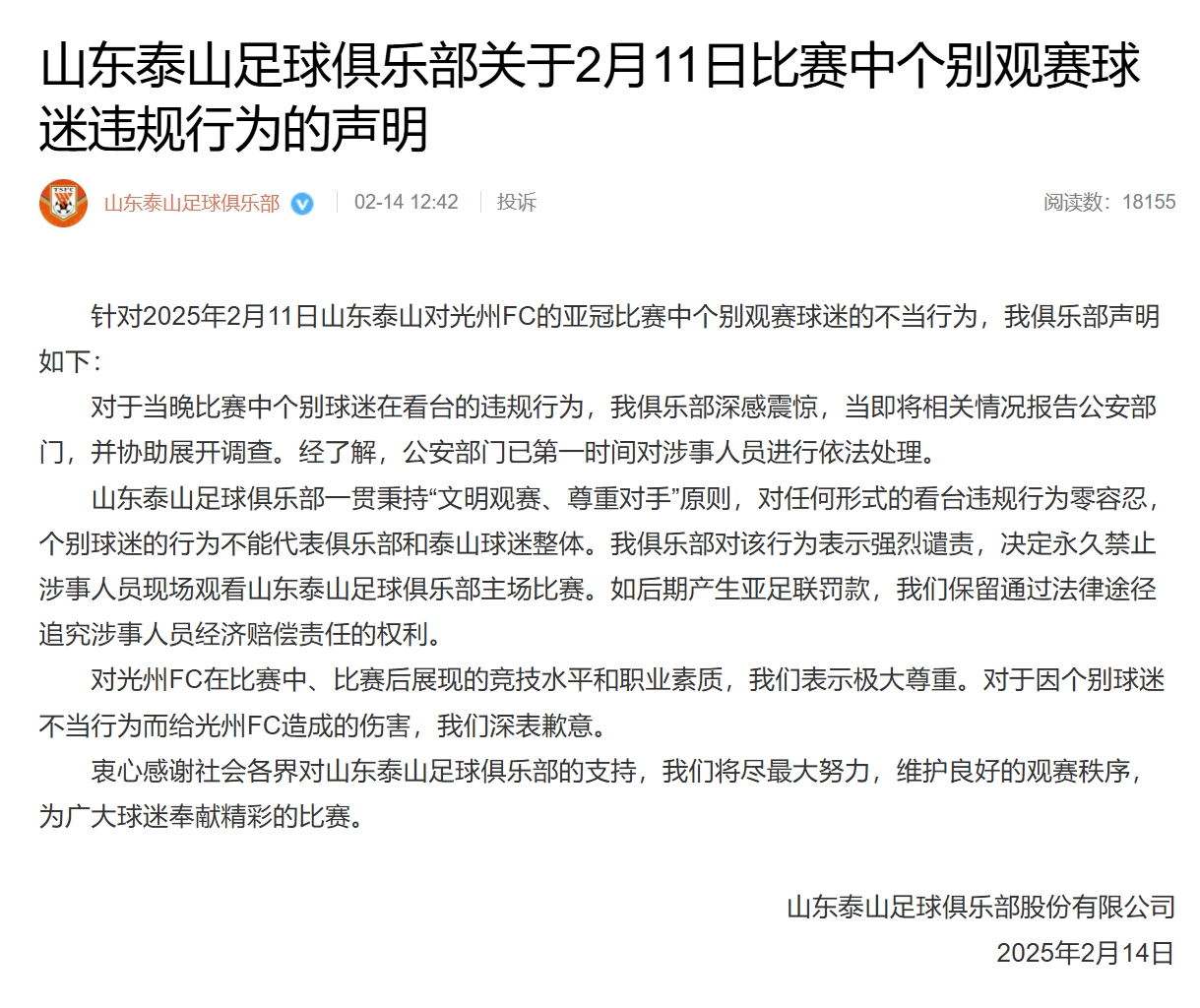 针对2025年2月11日山东泰山对光州FC的亚冠比赛中个别观赛球迷的不当行为,我俱乐部声明如下:
