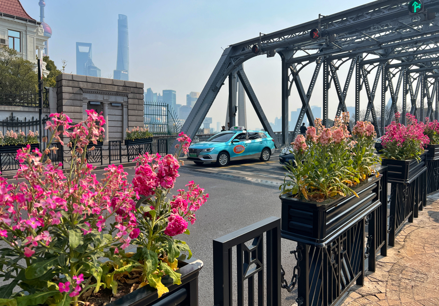外白渡桥两侧盛放的紫罗兰将该桥装点成了“花桥”。