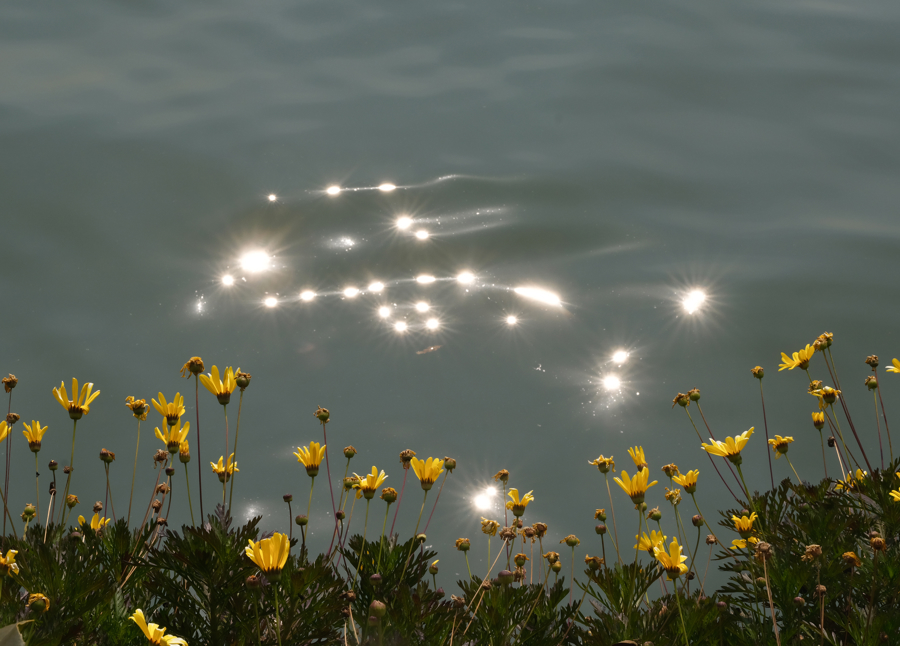 河边的菊类植物在阳光中次第开放。