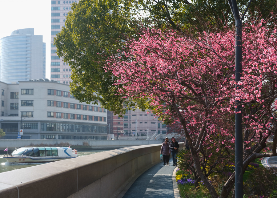 春意渐浓,在苏州河沿岸,紫罗兰、梅花、郁金香、茶花等竞相盛开。市民置身其中,感受春日浪漫。