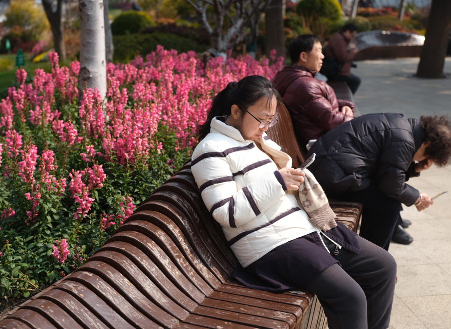 一簇簇紫罗兰旁,市民晒太阳、休闲,享受春光。